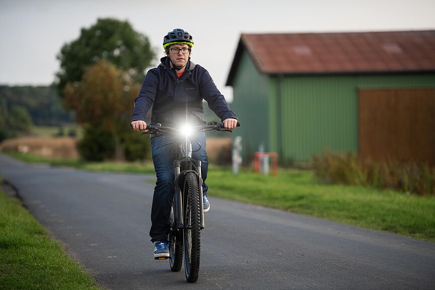 Der bekannte Tipp, das Fahrrad mit dem Vorderrad an eine Mauer zu rollen und dann die Oberkante des Lichtkegels knapp unter der Anbauhöhe des Scheinwerfers zu justieren, gilt zwar weiterhin als grobe Orientierung. Aber: „Radfahrende rufen damit nicht das volle Potenzial ihrer Lampen ab. Sie konzentrieren sich bei der Einstellung nur auf einen Punkt, dabei liefern viele Scheinwerfer einen breiten Lichtteppich über viel größere Strecken“, erklärt Feßen-Fallsehr. Moderne LED-Scheinwerfer haben eine deutlich höhere Leuchtweite als die früheren Fahrradlampen. Topmodelle können, richtig eingestellt, rund 100 Meter weit die komplette Fahrbahnbreite sehr gut ausleuchten. „Für die meisten Radfahrer:innen ist eine Ausleuchtung bis ca. 50 Meter aber am angenehmsten“, weiß Feßen-Fallsehr. Das bringt den Radfahrenden den Vorteil einer besseren Sicht – selbst bei höheren Geschwindigkeiten. Deshalb ist die richtige Einstellung auch abhängig von der durchschnittlichen Fahrgeschwindigkeit, wie der Lichtexperte erläutert: „Es ist wichtig, den Scheinwerfer so einzustellen, dass man die Helligkeit optimal nutzen kann. Das ist gerade bei höheren Geschwindigkeiten um 25 bis 30 km/h, wie sie beispielsweise sportliche Radfahrer:innen oder E‑Biker:innen leicht erzielen, wichtig, um sicher vorausschauend fahren zu können.“ Sein Tipp deshalb: Testfahrten abseits des Verkehrs, z. B. auf einem dunklen Parkplatz, um die individuelle, der Fahrgeschwindigkeit angepasste Einstellung zu finden.